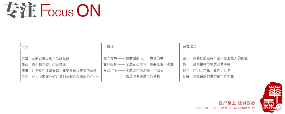 秉承“客戶為上”的原則,以市場為導(dǎo)向,以“視頻營銷戰(zhàn)略”為教程,讓每一部影片的作用發(fā)揮到極致。
